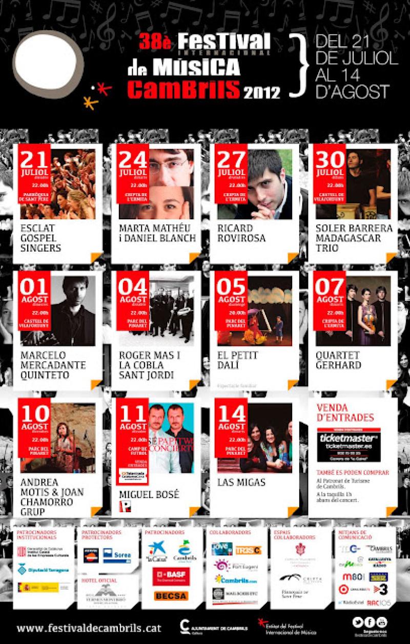 Cambrils. Costa Daurada. Comença la recta final del Festival Internacional de Música 2012 de Cambrils, que clourà el proper dimarts 14 d'agost després d'una dotzena d'actuacions. En la darrera setmana hi trobem propostes musicals per a tots els gustos: Andrea Motis & Joan Chamorro Grup oferiran una selecció de temes que inclouen clàssics del jazz de la primera meitat del segles XX, amb incursions en la bossa nova. Dia: 10 agost - Lloc: Parc del Pinaret - Preu: 22 / 20 euros. Miguel Bosé actuarà a Cambrils dins la gira Papitwo, on interpretarà noves versions dels seus èxits més coneguts i farà duet amb destacades figures del panorama musical. A més de ser el plat fort del FIMC, aquest concert és l'única oportunitat per veure en directe Miguel Bosé a la Costa Daurada. Dia: 11 d'agost – Lloc: Camp de Futbol de Cambrils – Preu: 30 / 40 / 50 euros. Las Migas, un dels col·lectius més renovadors del flamenc català, presneta nou treball en directe a Cambrils, en el darrer concert del festival. Amb el flamenc com a base, el mestissatge com a doctrina, i el segell femení, Las Migas creen un univers sonor tan divers com la procedència de cadascuna d'elles. Dia: 14 d'agost – Lloc: Parc del Pinaret – Preu: 14 /15 euros.
