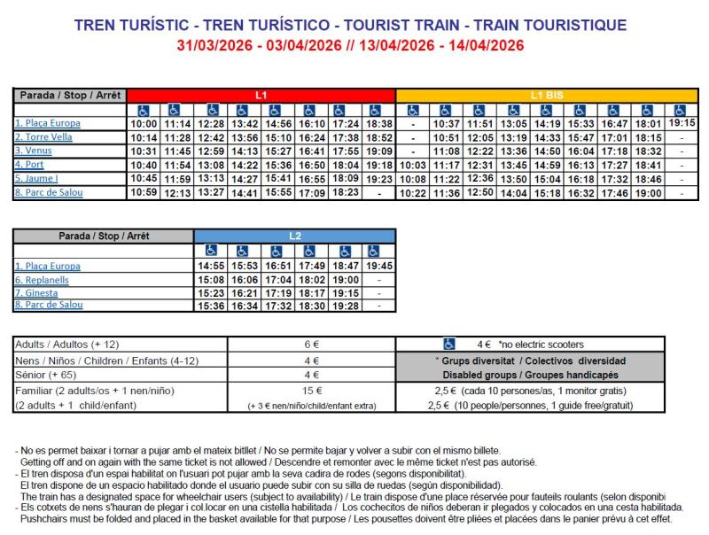 Preus:Els preus del tren turístic de Salou per al 2026 són els següents: