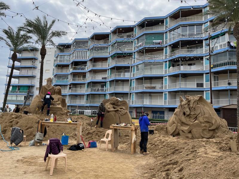 Salou. Costa Dorada. 09 December 2022. Eight international artists will be in charge of erecting on constructions in sand on the beach of La Pineda in the traditional Pesebre de Arena (Sand Manger). This edition will feature the history of Art. The artist come from Denmark, Latvia, Belgium, the Netherlands, Italy, the Czech Republic and also from Catalonia, shape the arena to obtain a unique and different sculptural group year after year, which in this edition pays homage to art, through a journey through its most representative stages: from prehistory to the abstract art of our times.