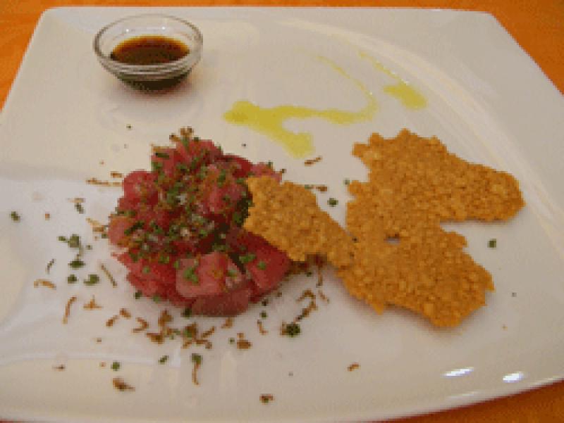 Cocinero: Carlos Martínez Jefe de sala: Rafael Martínez Tipo de cocina: Casera Capacidad: 35 personas Horario: De 13 a 15h. Descanso semanal: Miércoles Precio: 38 euros Dirección: Ermita de Santa Marina – Pratdip Teléfono: 977 262095 / 619 390 468 Entrante: Entrante degustativo y copa de cava. Primer plato: Tartar de atún con trufa blanca de la Sierra de Llaberia, vinagreta de balsámico y teja de parmesano. Segundo plato: Atún a la brasa con olivada y tomate al horno. Postre: Pastel de frutos secos. Bodega: vino La Cuina d’en Carlos – D.O. Montsant Tartar de atún con trufa blanca de la sierra de Llaberia, vinagreta de balsámico y teja de parmesano Ingredientes para 4 personas - 500 gr. de lomo de atún - 20 cl. de vinagre balsámico - 2 filetes de anchoas en salazón - 110 cl. de aceite de oliva virge extra D.O. Siurana - Zumo de limóm - Escamas de sal - Cebollino picado - Trufa blanca (sierra de Llaberia) - 100 gr. de queso parmesano - 20 gr. de harina - Papel para el horno RECETA Cortar el atún en dados de 1cm.x 1cm.. En un bol preparamos la vinagreta, emulsionando aceite de oliva, el vinagre balsámico, las anchoas (limpias, haciendo una pasta) y el zumo del limón. A continuación, mezclamos los dados de atún con la vinagreta. Para hacer la teja de queso parmesano, con la ayuda de la picadora, haremos el queso bien fino y lo mezclaremos con la harina. En una bandeja para el horno, ponemos el papel para el horno i extendemos el queso, horneamos a 180ºC, unos 8 o 10 minutos. Después lo dejamos enfriar y lo cortamos simulando triángulos. Con la ayuda de un molde redondo, ponemos los dados de atún y encima unas láminas de trufa blanca, salamos con la flor de sal y añadimos el cebollino picado. Emplatamos la teja de parmesano y encima el tártaro de atún.