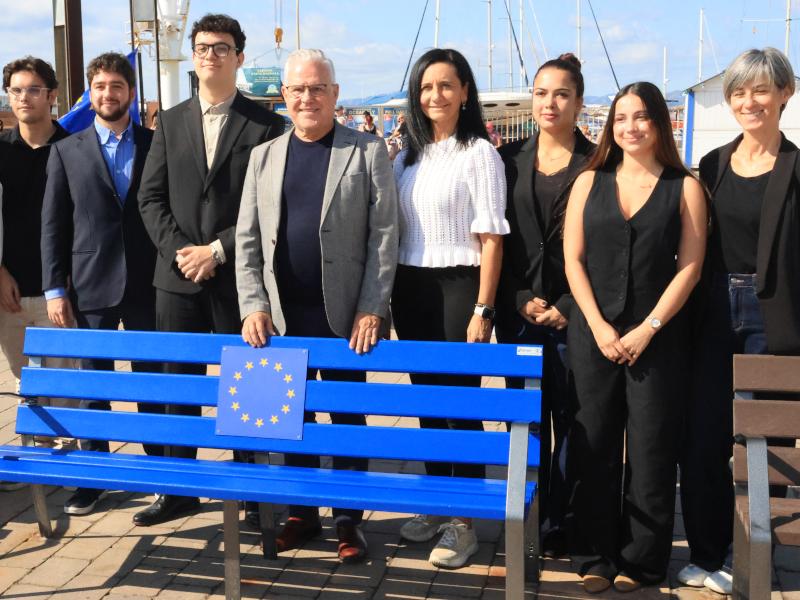 Salou. Costa Dorada. 26 septiembre 2025. El alcalde de Salou, Pere Granados, ha inaugurado en el Espigó del Moll el “Banco por Europa”, un banco que se ha pintado con los colores de la bandera de la Unión Europea. El banco es el símbolo de la entrada del municipio en la red de ciudades que defienden activamente los valores europeos, especialmente entre la juventud. Es el primer Banco por Europa inaugurado en la provincia de Tarragona y el tercero en toda Catalunya. Al acto también han asistido la concejal de Participación, Julia Gómez, y la de Joventud, Noelia Izquierdo.